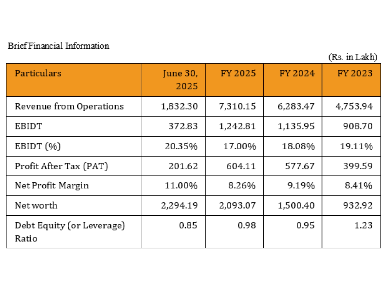 - For FY24-25 company reported revenue of Rs. 73.10 crore and net profit of Rs. 6.04 crore and for June 30, 2025 (3 months), Revenue of Rs, 18.32 crore and net profit of Rs, 2.02 crore.